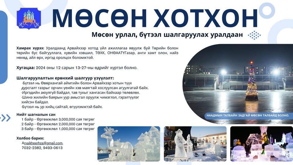 Арвайхээр хотын наадмын талбайн задгай мөсөн талбайд “МӨСӨН ХОТХОН” мөсөн урлал, бүтээл шалгаруулах уралдааныг зарлаж байна.